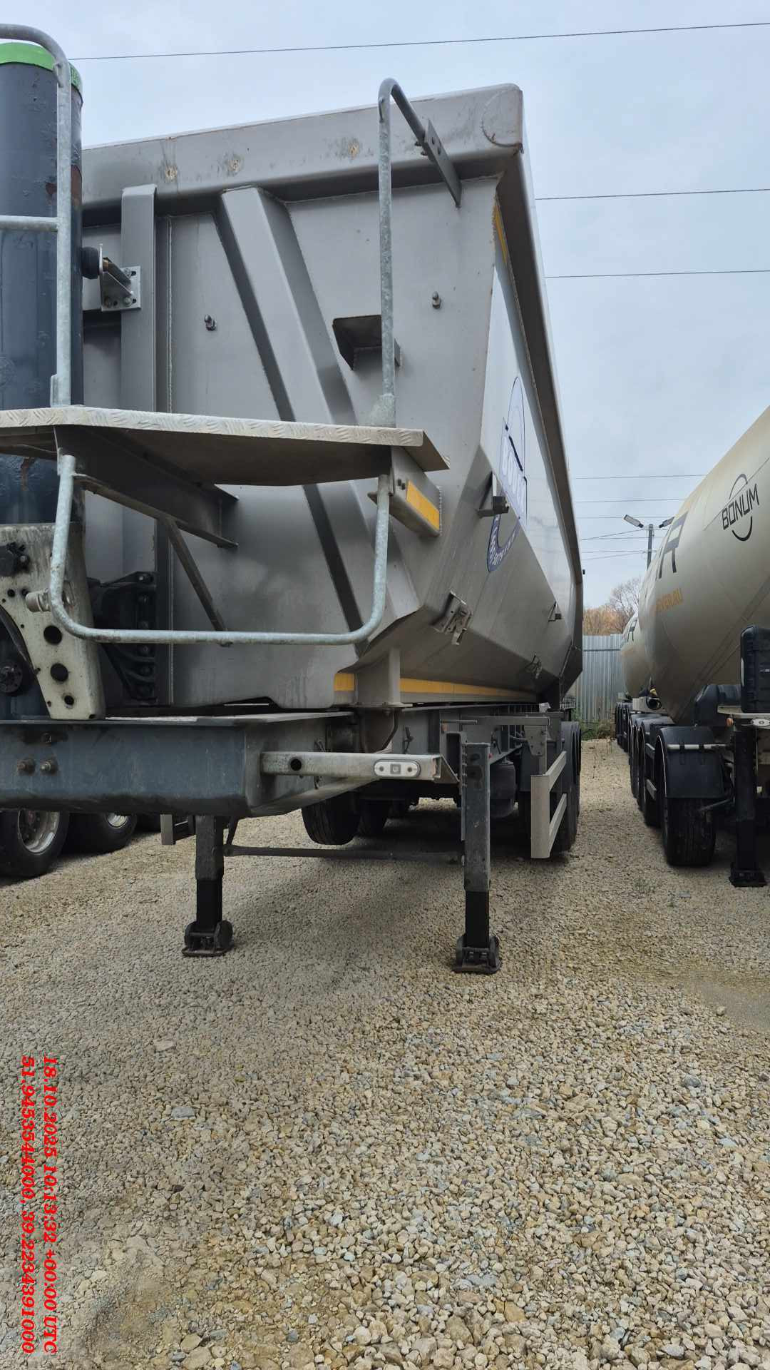 Лизингодатели: Номер лота 000016678 Ответственный Стешинский Денис ДЛ 17045-ВРЖ-22-АМ-Л Самосвальный полуприцеп марки «BODEX» V=35 м.куб. со стальным кузовом типа «Half-Pipe», модель KIS-3WS2. Трехосный самосвальный полуприцеп BODEX V=35 м.куб. с задней разгрузкой, предназначен для перевозки сыпучих инертных материалов (песок, щебень, гравий, асфальт и т.д.). Полуприцеп предназначен для эксплуатации с седельными тягачами с колесной формулой 4х2, 6х2, 6х4, высотой седельно-сцепного устройства 1150/1300 мм и нагрузкой на седельно-сцепное устройство не менее 11 000 кг. ТЕХНИЧЕСКИЕ ХАРАКТЕРИСТИКИ: Кузов: •С фиксированными передним и боковыми бортами, на внешней стороне переднего борта помост со ступеньками; •Материал кузова – низколегированная шведская сталь HARDOX 450; •Кузов изготовлен из цельного листа стали с применением гибочного пресса по «бесшовной» технологии. Толщина стального листа – 4,5 мм; •Кузов установлен на раме и фиксируется в транспортном положении по центру; •Задний борт наклонный с верхней осью вращения, на двух шарнирах, с резиновым уплотнителем; •Привод замка заднего борта механический; •Кузов оснащен сдвижным тентом толщиной 900 гр/м. Рама: •Усиленная из микролегированной стали QSTE-690, состоит из двух сварных продольных лонжеронов, соединенных между собой траверсами и балками. К нижней части рамы приварен разгрузочный лист из низколегированной стали ; •Сцепное устройство – плита сцепки с 2” шкворнем JOST (Германия); •Опорное устройство двухдиапазонное телескопическое BPW (Германия) г/п 24 т с ручным односторонним приводом. Шасси: •Ошиновка односкатная, количество колес 7 штук; •Шины Continental HTR-2XL (нагрузка 5 тонн), размерности 385/65 R22,5; •Оси SAF с нагрузкой на ось 11 тонн; •Диски 11.75х22,5 стальные штампованные Lemmerz (Германия); •Полные подкрылки DOMAR (Италия) - 6 штук, задние с резиновыми брызговиками; •Корзина для запасного колеса. Подвеска: •Трехосная пневморессорная (пневматическая на полуэллиптических усиленных рессорах) производства SAF (Off road) (Германия), с технической нагрузкой на ось 11 тонн и оригинальной гарантией производителя; •Первая ось оснащена 2-х сторонним подъемным механизмом Wabco; •Функция быстрого спуска воздуха из пневмобаллонов подвески при разгрузке полуприцепа. Тормозная система: •Двухпроводная пневматическая с тормозными механизмами барабанного типа (420х200) с приводом на все колеса, рычаги разжимного кулака с автоматической регулировкой зазора Knor-Bremse; •Стояночный тормоз – пневматический с приводом от энергоаккумуляторов на две оси; •Антиблокировочная система тормозов EBS Wabco 4S/2M(Германия). Гидроцилиндр: •Binotto 5-секционный 7 метровый с телескопическим гидроцилиндром грузоподъёмностью до 50 тонн обеспечивающего угол разгрузки до 45°. (Гарантия производителя 1 год). Окраска: •Все стальные элементы перед лакировкой были дважды подвергнуты дробеструйной обработке, нанесение лака в лакировочной камере, применяются эмали фирмы PPG (Италия) с толщиной слоя 150-200 микрон, цвет по выбору заказчика по каталогу RAL, в цветовой гамме более 100 цветов, без доплаты за цвет, включая цвет металлик. Другое оборудование: •Заднее защитное устройство (противооткатный брус, складной) и боковое защитное устройство соответствуют ГОСТ Р 41.58-2001 (Правила ЕЭК ООН №58); •2 клина с креплением (противооткатные башмаки); •Фиксатор транспортного положения кузова – замок Hi