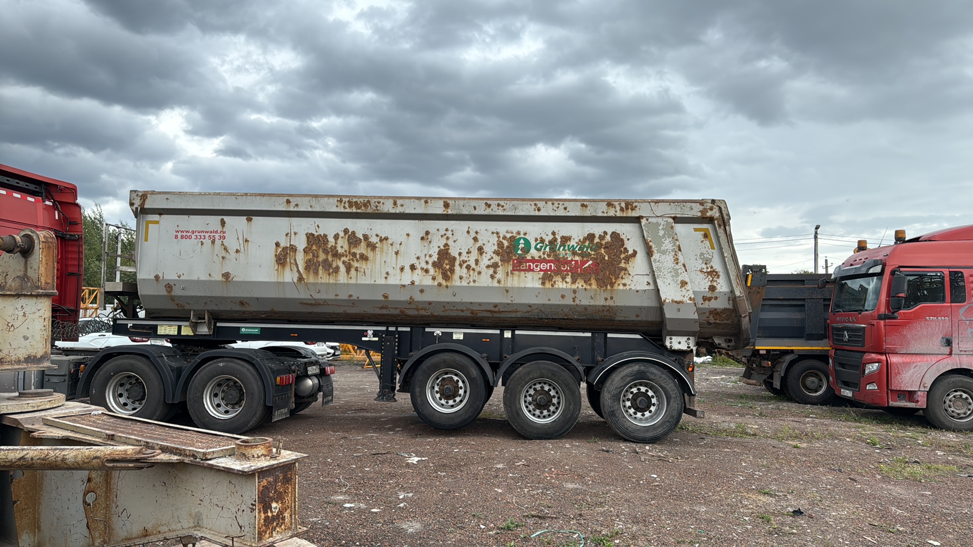 Описание: Ответственный за реализацию ТС: Целищев Алексей Витальевич Номер лота: 000013187 Место осмотра: г. Пермь Технические характеристики: Полуприцеп-самосвал Grunwald TSt 34 предназначен для перевозки сыпучих грузов и отличается прочной конструкцией, рассчитанной на эксплуатацию в тяжёлых дорожных условиях. Технические характеристики •Категория транспортного средства: О4 •Допустимая полная масса: 38 000 кг •Грузоподъёмность: 29 450 кг •Собственная масса: 8 550 кг •Нагрузка на осевой агрегат: 27 000 кг •Нагрузка на ССУ: 11 000 кг •Высота ССУ: 1 220 мм •Геометрический объём кузова: 34 м? •Габариты: длина — 9 517 мм, ширина — 2 500 мм, высота — 3 300 мм •Высота кузова по передней стенке: 1 800 мм •Внутренняя ширина кузова: 2 288 мм •Максимальный угол подъёма кузова: 44° •Размер шин: 385/65 R 22,5 Конструкция шасси •Сварная рама усиленной конструкции, адаптированная для тяжёлых условий эксплуатации. •Усиленная плита сцепки. •Рабочая площадка в передней части выполнена из алюминия. •Опорное устройство — механическое, двухскоростное, европейского производства. Конструкция кузова •Борта и днище изготовлены из стали 09Г2С (толщина: борта — 6 мм, днище — 8 мм). •Передняя стенка — прямая, выполнена из стали S355 (Германия). •Задний откидной борт (наклонный 15°) также из стали S355, закреплён на подшипниках и снабжён автоматическими замками. •Усилительный фартук выполнен из стали S355. Гидравлическая система •Телескопический гидроцилиндр HYVA (Голландия) / Binotto (Италия) с нижним креплением, обеспечивающий угол разгрузки до 44,5°. •Ответная часть гидрошланга с муфтой O 2\". Оси и подвеска •Трёхосная схема, каждая ось грузоподъёмностью 12 000 кг. •Возможна установка осей SAF (Голландия) IntraDrum Custom Design с балкой круглого сечения. •Межосевое расстояние — 1 310 мм. •Подвеска — пневматическая, с клапаном подъёма и опускания платформы (H/S). Тормозная система •Тормозные механизмы: барабанного или дискового типа (в зависимости от комплектации). •Электронная система управления тормозами EBS Wabco (соответствует ECE). •Автоматическая регулировка тормозов. •Стояночный тормоз — пневматический, с приводом от энергоаккумуляторов на две оси. Электрооборудование •Двухпроводная система, напряжение 24 В. •Задние фонари — пятикамерные, с интегрированными треугольными отражателями. Шины и диски •Ошиновка односкатная: 6 колёс + 1 запасное. •Шины Michelin, размерность 385/65 R22,5. •Стальные усиленные диски импортного производства. ________________________________________ Таким образом, Grunwald TSt 34 — это прочный и надёжный самосвальный полуприцеп с объёмом кузова 34 м?, высокой грузоподъёмностью и комплектующими ведущих мировых производителей, обеспечивающими долговечность и эффективность эксплуатации. Покупка возможна удобным для вас способом — оформление в лизинг или покупка за собственные средства. У нас обширная география присутствия на территории страны – более 70 офисов, поэтому наши менеджеры помогут заключить договор в любом городе России. Стоимость в объявлениях уже включает НДС. Записаться на осмотр и узнать более подробную информацию вы можете у наших специалистов по телефону, указанному в объявлении. Звоните! Мы — компания Альфа-Лизинг. Более 26 лет мы работаем с предпринимателями и создаём лизинговые продукты, предлагая для покупки легковые и грузовые автомобили, лёгкий коммерческий транспорт, прицепы и полуприцепы
