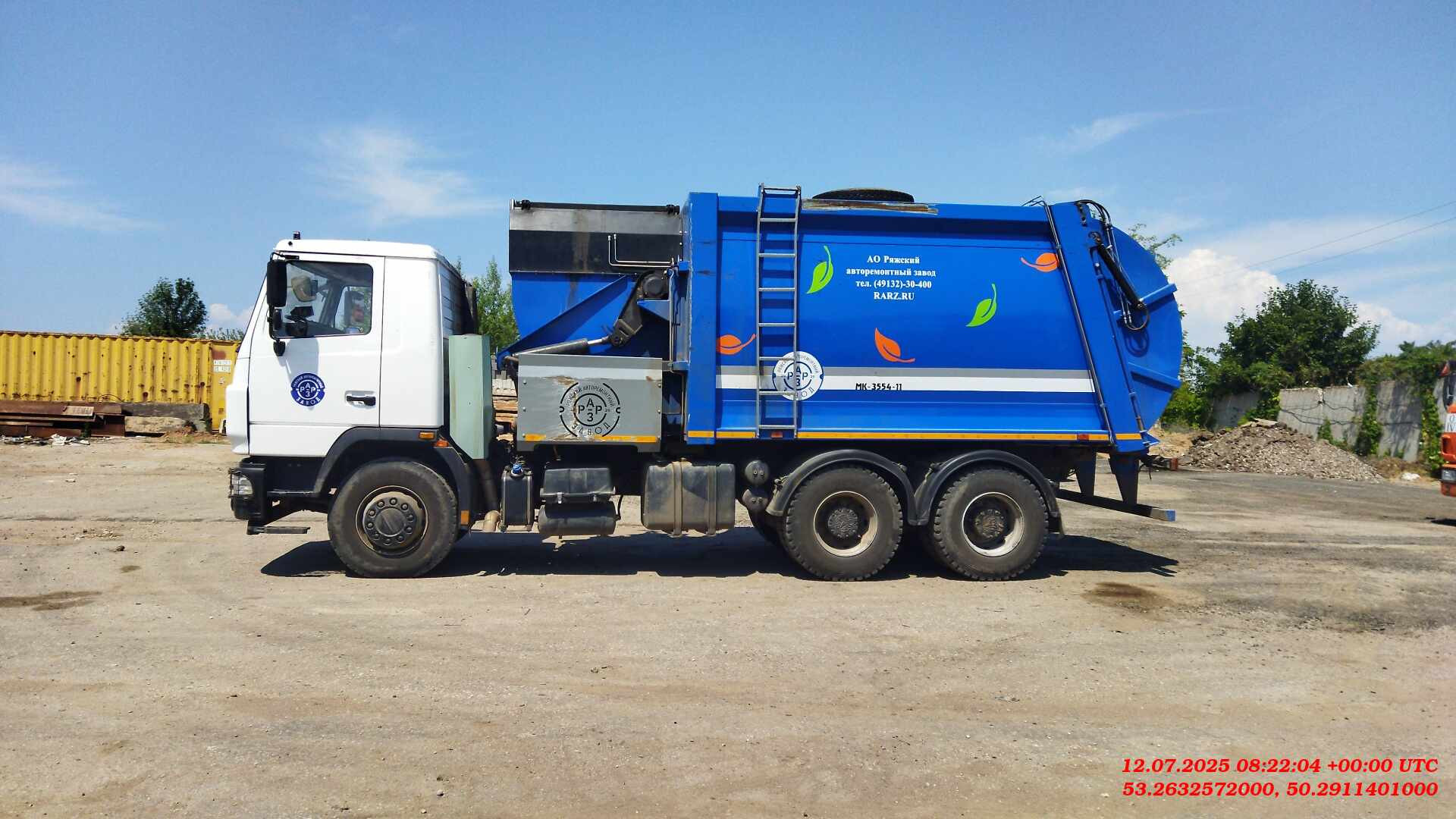 Лизингодатели: Мусоровоз МК-3554-11 (верхняя боковая загрузка, бескаркасный кузов объёмом 21,7 куб.м, маятниковая плита, универсальный захват под все типы евро-контейнеров, система автоматики, коэффициент прессования до 6) на шасси МАЗ-631226-585-042. |