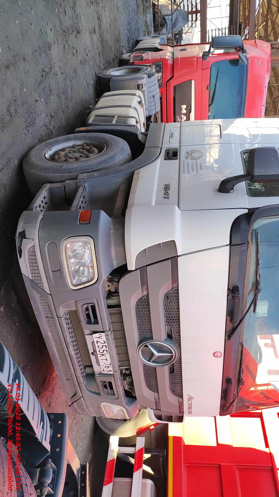 Лизингодатели: Спецификация Шасси Mercedes-Benz Arocs 5 4145 AK 8x8/4 Модель: Mercedes-Benz Arocs 5 Тип автомобиля: 4145 AK Колесная формула: 8x8/4 Базовая модель: 96423312 Вариант шасси: Полноприводное самосвальное шасси Тип кабины: М-кабина Мощность двигателя: 330 kW (449 PS) Колесная база: 4850 мм Допуст. полная масса: 48000 кг Рулевое управление: слева Шины 1. ось: 2x 325/95 R 24 Michelin L94K22 80 -- 2. ось: 2x 325/95 R 24 Michelin L94K22 80 -- 3. ось: 4x 325/95 R 24 Michelin L94K23 80 -- 4. ось: 4x 325/95 R 24 Michelin L94K23 80 -- Запасное колесо: 1x 325/95 R 24 Michelin L94K22 80 Оборудование Стандартное оборудование A1Y Прямая балка переднего моста Блокировка дифференциала задней оси B1A Электронная тормозная система с ABS B1H Блок подготовки воздуха с электронным управлением B1Z ABS, отключаемая B2B Барабанные тормоза на передней и задней осях B2X Электронный стяночный тормоз B4M Ресиверы для сжат. возд., стальные Мигающий сигнал экстренного торможения Стояночный тормоз, со звуковым сигналом Разъем спереди для подачи сжатого воздуха C0B Задний свес 800 мм C2T Колесная база 4850мм C5J Кронштейны крепления кузова, для самосвала C6J Насос гидроусилителя не регулируемый C6Q Стабилизатор передней оси C7A Задний противоподкатный брус (ECE) C7K Аккумуляторный отсек, батареи друг над другом C8F Крылья транзитные для перегона / доставки с завода CLW Масляное охлаждение рулевого механизма Отверстия в раме, непрерывные D0S Разъем в кабине для подачи сжатого воздуха D1B Сиденье водителя с подвеской, стандартное D1N Откидное сиденье пассажира D3X Обивка сидений, дизайн \"Skyline\" D6Z Фильтр для работы на стройплощадке D8A Люк в крыше кабины Многофункциональное рулевое колесо Держатель для бутылок Электрические стеклоподъемники Подсветка ступенек, в двери Место для хранения документов, формат А4 DUP0 Basetype E3L Разъем, 24 В/15 A, со стороны пассажира E3W PSM модуль, 2 поколение F0G Боковой модуль, автомобиль категории N3G F0Y Корпус зеркала задн. вида, авт. для строительства F2C Вариант пола, моторный туннель 320 мм F2G Ширина кабины 2,30 м F2N Кабина, высота посадки 600 мм F2U ClassicSpace F3A Подвеска кабины стандартная, пружинная F3W Механизм подъема кабины, механич.-гидравлич. F5Y Отделка передней стойки F7B Бампер, со стальными краями F7D Бампер, средняя часть с буксировочными проушинами F7Y Подножка кабины, слева/справа, подвижная F8B 2 ключа с дистанционным управлением F8E Центральный замок Кабина, усиленная Air deflectors, corner panels Бордюрное зеркало G0R Крепления для КП, оптимизированные для демонтажа G0W Режим движения Offroad__ G4D Раздаточная коробка VG 2800-3W/1.45-1.04, пост. G5G Mercedes PowerShift 3 J1A Приборная панель, дисплей 10,4 см J6A Classic Cockpit Бортовая диагностика Бортовой маршрутный компьютер Система бортового контроля K0T Главный бак, слева K7R Выхлопная труба прямая, над второй осью Боковые габаритные огни Общее освещение Диодные контурные габаритные фонари M0A Крепления двигателя усиленные M0C Пластиковая защита от грязи под радиатором и двиг. M3B Двигатель OM471, R6, 12.8л, 330кВт (449лс), 2200Нм M5B Двигатель ОМ471 2-го поколения M6L Компрессор, двухцилиндровый M7I Антимоскитная сетка перед радиатором M7J Защита под бампером M7U Cooling output for hot regions M8B Забор воздуха, сверху, крепление за кабиной N2E КОМ MB 131-2c, под насос N6Z Система охлаждения масла коробки передач P0S Свободн.место для органов упр., около водит. сид. Задняя поперечина в средней позиции S5Z Круиз-контроль V0T Категория N3G, ТС для бездорожья V1B Arocs V1Z Grounder V2J Модель Arocs, поколение 5 V8A Номер шасси FIN X2H Идентификационная табличка, исполнение для 