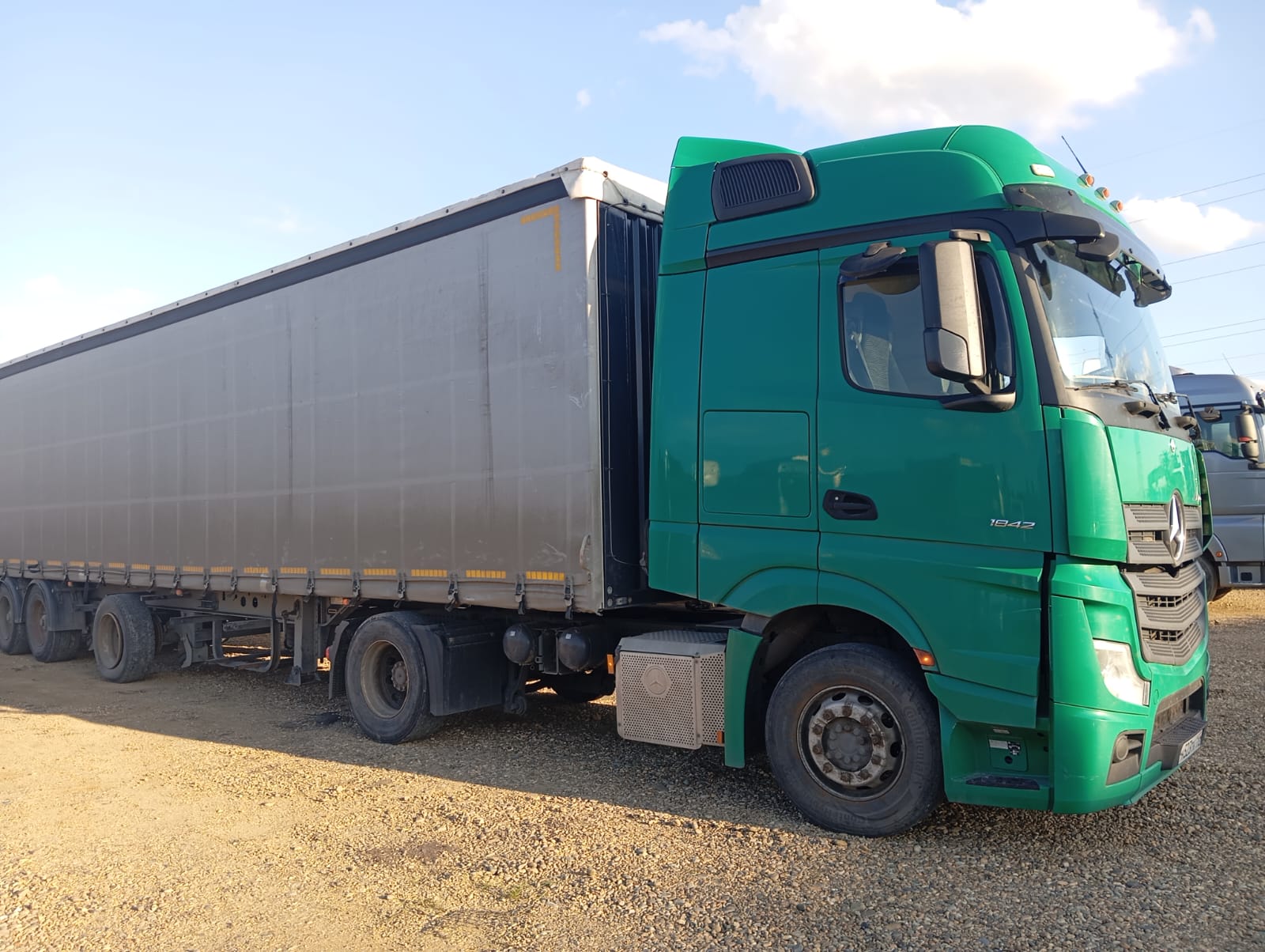 Лизингодатели: Модель: Mercedes-Benz Actros 4 Тип автомобиля: 1842 LS Колесная формула: 4x2 Тип кабины: BigSpace Колесная база: 3850 мм Допуст. полная масса: 19000 кг Рулевое управление: слева Смещение ССУ: 750 мм Список оборудования дублирующая группа кодов, уровень 1 * \u003e\u003e\u003e Basetype Исполнение шасси V1A Actros V1W Стандарт C1Y Колесная база 3850 мм Распределение нагрузки на оси W0T Вариант с полной массой 19.0 т (7.5/13.0) Двигатель M3A Двигатель OM471, R6, 12.8л, 310кВт (421лс), 2100Нм M5B Двигатель ОМ471 2-го поколения Z5E OM 471 M5S Исполнение двигателя Евро 5, экспорт M8B Забор воздуха, сверху, крепление за кабиной M8Y Фильтр топливный с подогреваемым влагоотделителем M7V Cooling output for very hot regions M9Z Отказ от шторки радиатора M7I Антимоскитная сетка перед радиатором M5U Моторный тормоз, стандартная система M6M Компрессор, 2-ступенч., оптимиз. потребл. топлива M0A Крепления двигателя усиленные M0E Увеличенный крутящий момент на 12-й передаче Сцепление и трансмиссия G5A Однодисковое сцепление G2B Коробка передач G 211-12/14.93-1.0 , автоматическое переключение передач N6Z Система охлаждения масла коробки передач G5G Mercedes PowerShift 3 G0U Режим движения Economy Оси и подвеска A1Z Выгнутая балка переднего моста A1C Передняя ось 7,5 т A2E Задний мост, ведомая шестерня 440, гипоидн., 13,0т * \u003e\u003e\u003e Блокировка дифференциала задней оси A5B Передаточное число главной передачи i = 2.533 Q1S Передние рессоры 7,5 т, 2-х листовые Q3X Пневморессоры для холодных условий экспуатации C6Q Стабилизатор передней оси J3Z Устройство измерения нагрузки на ось Колёса и шины R1Q Колесные диски 9.00 x 22.5 R8A Держатель запасного колеса, сбоку R8P Диск запасного колеса R0Z Защитные колпаки для гаек крепления колес 1.А. F38L16 10 2x 315/70 R 22,5 -- Continental Hybrid HS3(M) 2.А. F38L88 10 4x 315/70 R 22,5 -- Continental Hybrid HD3 F38L16 10 1x 315/70 R 22,5 -- Continental Hybrid HS3(M) Рама и элементы на раме * \u003e\u003e\u003e Отверстия в раме, непрерывные C5B Закабинная площадка, частичное покрытие C5P Сборка рамы на болтах C7Z Частично разобранная рама, степень II (CKD) C0G Задний свес 1050 мм C6C Рулевое управление, одноконтурное C6J Насос гидроусилителя не регулируемый CLW Steering oil cooling C7T Компоновка агрегатов в заднем свесе рамы K0T Главный бак, слева K1P Бак, 630 л, слева, 650 x 700 x 1600 мм, алюм. K3V AdBlue бак, 60 л, слева K5M Баки, запираемые K5Q Сетка в горловине топливного бака K5S Защитная крышка системы дозирования AdBlue Z4O Топливный бак узкого поперечного сечения Z4R Поперечное сечение бака, высок. K7I Выпускная система, на раме, справа, выхлоп внутрь C8C Задние крылья, для ТС шириной 2500 мм C8H Крылья, 3-секционные, с защитой от разбрызг. (ЕС) C8I Брызговики передних колес (ЕС) C8M Средняя часть крыльев низкая C7F Передний противоподкатный брус, алюм. C8Y Нижние аэродинамические панели F7A Бампер, с пластиковыми краями F7C Бампер, центральная часть с буксир. проушинами * \u003e\u003e\u003e Задняя поперечина в средней позиции Q4I Высота седельно-сцепного устройства Н = 150 мм Q4X Седельно-сцепное устройство, ручная смазка Q5Q Седельно-сцепное устройство, Jost JSK 37C Q6A Монтажная плита, 12 мм, 20 т Q6Z Монтажные уголки ССУ с отверстиями H2F Смещение седельно-сцепного устройства +750 мм Q0W Седельно-сцепное устройство с завода Q0Y Внешний угол наклона ССУ не в соотв.с DIN ISO 1726 Тормозная система B2A Дисковые тормоза на передней и задней осях B1B Электронная тормозная система с ABS и ASR B1D Блок подготовки воздуха, средняя производ. B1F Блок подготовки воздуха с подогревом B4A Датчик конденсата, для пневмосистемы * \u003e\u003e\u003e Разъем спереди для подачи сжатого воздуха B4M 