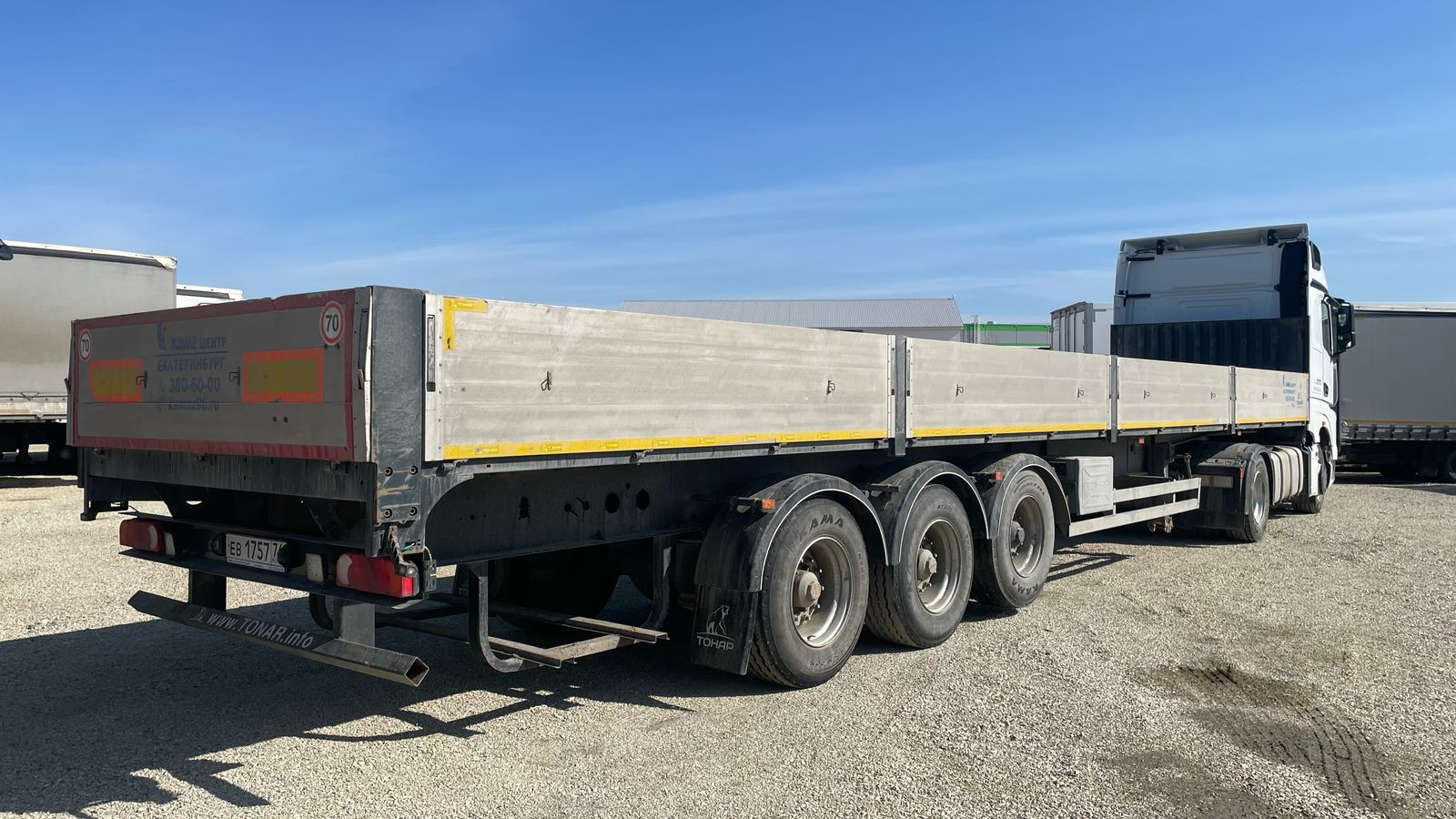 Описание: Полуприцеп бортовой ТОНАР B3-13 (9888) Технические характеристики Масса перевозимого груза, кг.27 050 Масса снаряженного полуприцепа не более, кг.7 300 Полная масса полуприцепа, не более, кг.34 550 Высота седельно-сцепного устройства тягача, мм.1 200 Нагрузка на ССУ тягача10 350 Внутренние размеры полуприцепа, мм.длинна-13 660, ширина-2 480 Длина, мм.14 000 Ширина, мм.2 550 РамаЛонжероны двутаврового сечения, сталь 09Г2С, повышенной прочности, толщина полок лонжеронов рамы 10 мм, процесс сварки происходит в аргоновой среде сварочными тракторами и роботам Сцепной шкворень2 дюйма Подвесказависимая, на продольных упругих рычагах с пневматическими упругими элементами и телескопическими гидравлическими амортизаторами Оси колесТонар Осевая нагрузка, кг.27 000 Подъёмная осьПередняя, входит в базовую комплектацию Опорное устройствона 24т. Остальные характеристики Тормозная система Производитель Wabco, барабанные тормоза, рабочая тормозная система Пневмосистема Wabco EBS последнего поколения (TEBS-E) с ручным механическим управлением поднятия/опускания пневмоподвески |