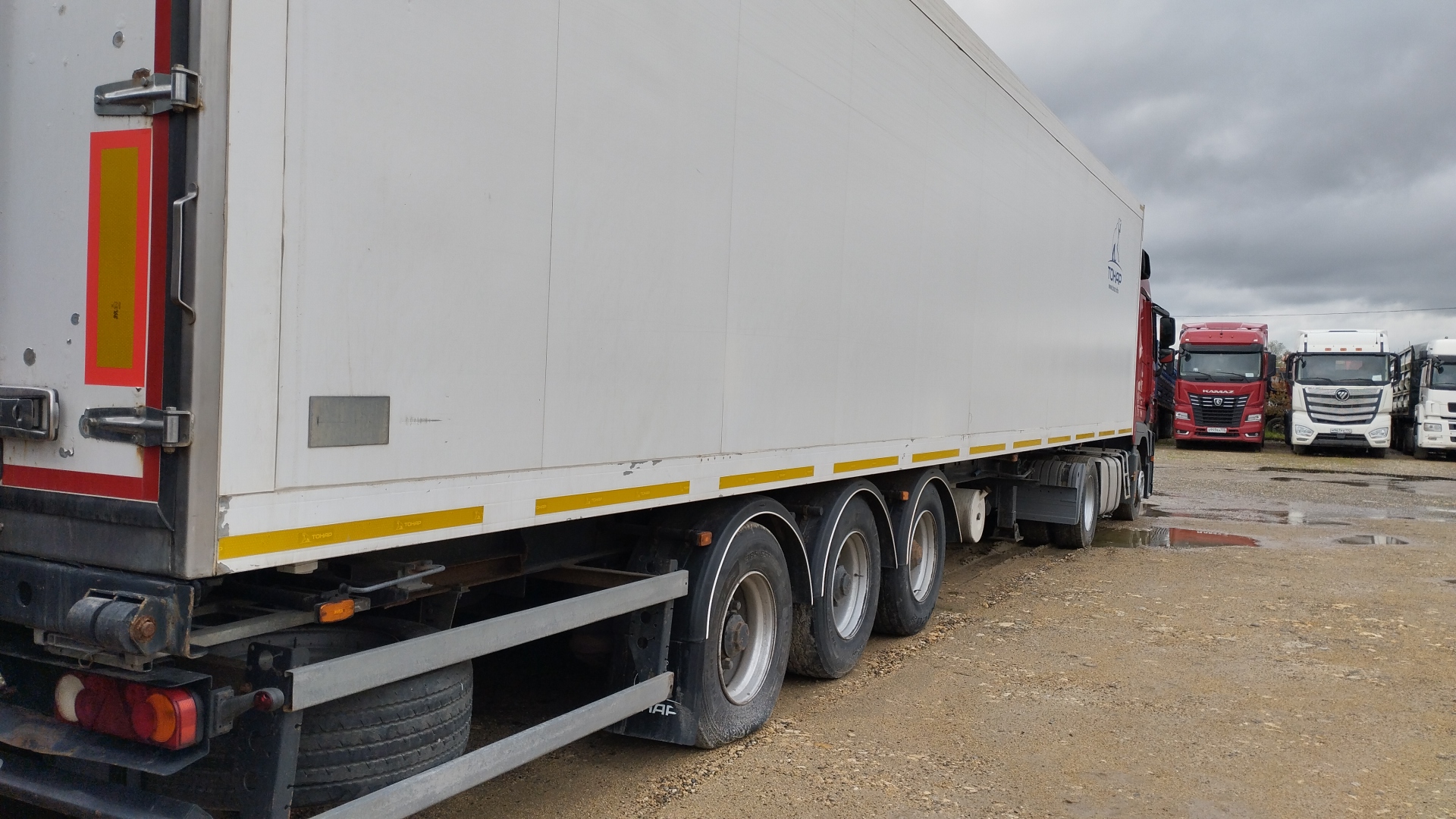 Лизингодатели: Технические характеристики Размеры: Длина (внутренние размеры), мм - 14 610 Ширина (внутренние размеры), мм - 2 460 Высота (внутренние размеры), мм - 2 560 Высота седельно-сцепного устройства, мм 1 150 Вес: Масса снаряженного полуприцепа, не более, кг - 8 750 Разрешённая максимальная масса, кг - 38 500 Нагрузка на ССУ, кг - 11 300 Осевая нагрузка, кг - 27 000 Оси \"Тонар\": Шины - бескамерные 385/65R 22,5 Подвеска - зависимая, на продольных упругих рычагах с пневматическими упругими элементами и телескопическими гидравлическими амортизаторами Подъёмная ось - передняя Остальные характеристики Задняя стенка - двустворчатая дверь, каждая створка на 4 петлях, 3-х уровневый резиновый уплотнитель; рама заднего проема из нержавеющей стали Крыша - сэндвич-панели; 6 потолочных светодиодных фонарей внутреннего освещения, смещенные в бок; включатель внутреннего освещения, срабатывающий при открывания дверей Боковые стенки - сэндвич панели с усиленной жесткостью (буковые закладные) Пол - сложная сэндвич панель, с алюминиевым полом, образующим с боковой отбортовкой герметичную ванну Опорное устройство - на 24 т Количество палет, шт - 36 Комплектации Модель Тонар-97863 (R3-14) ССУ 1 150 Тип изотермический полуприцеп Кузов сложная сэндвич-панель, с алюминиевым полом, образующий с боковой отбортовкой герметичную ванну Объем 90 куб.м Кол-во осей 3 Тип ошиновки односкатный Подвеска рычажного типа Тормозная система ABS |